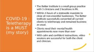 Presented by Jody Bechtold, LCSW, ICGC-II, BAC The use of teletherapy as a way of assisting clients has continued to become an important way to offer services. Geographical barriers, health concerns and transportation limits have resulted in the need for virtual communication. The current COVID-19 situation that we are all experiencing has amplified this need…